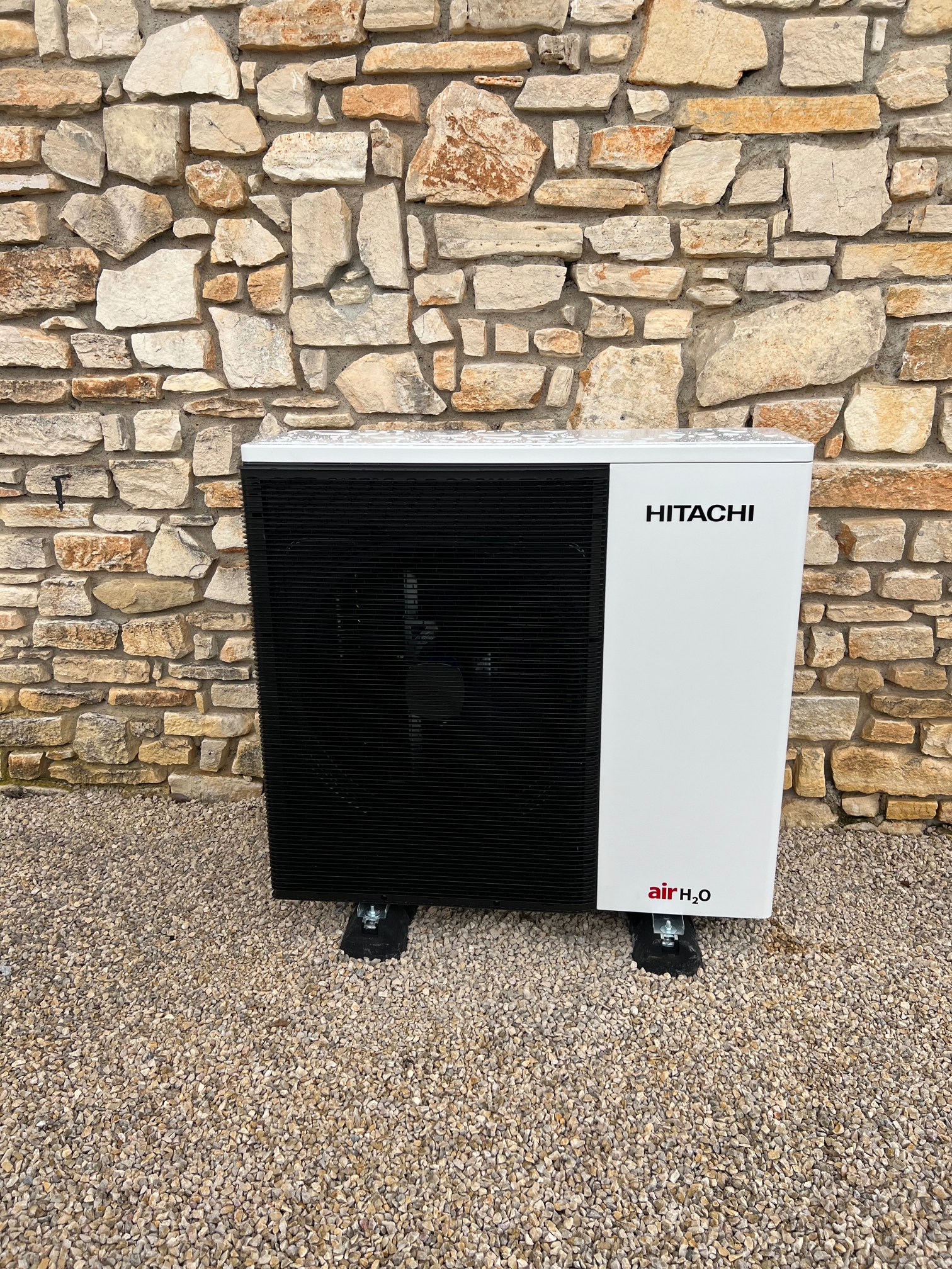 Installation d'une pompe à chaleur Air eau de marque HITACHI en remplacement de chaudière gaz, le systèmes gère l'eau chaude sanitaire et le chauffage au sol qui est réversible l'été en plancher rafraîchissant.